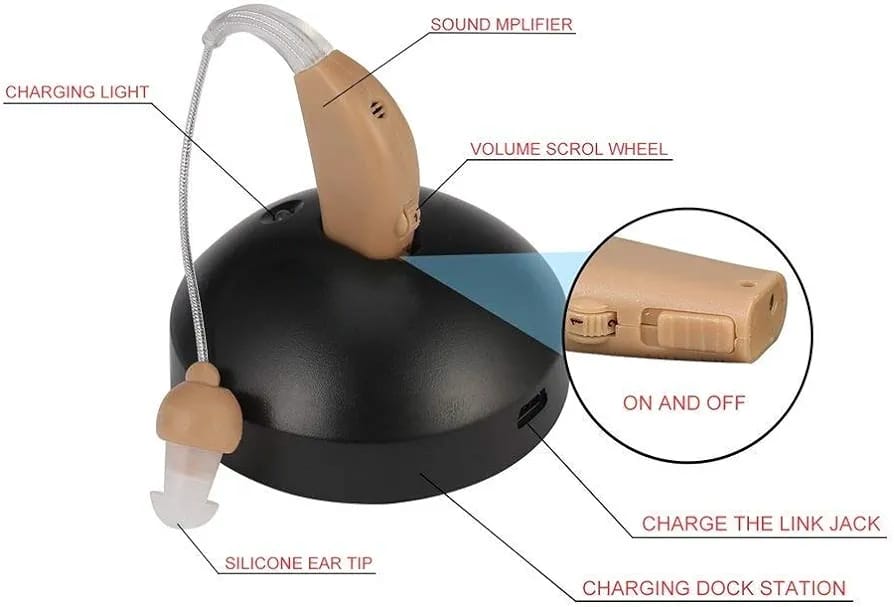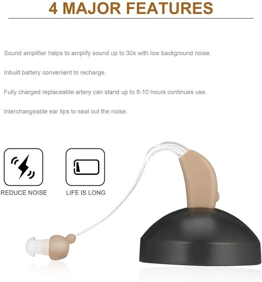 Audífono recargable amplificador de sonido para sordera o personas de discapacidad auditiva. Diseñado para el uso de oido izquierdo y/o derecho.